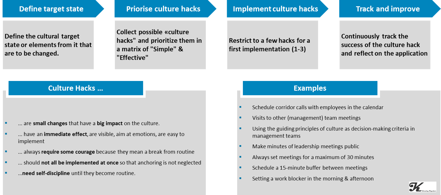 „Culture Hacks“ are against this background small behavioural changes of persons or groups with scaling potential. An effective „culture hack“ is a change in behaviour that is as small as possible and easy to implement, with a major impact on collective behaviour. For this reason, „culture hacks“ can also be understood as a „butterfly effect“ for organizational transformations.