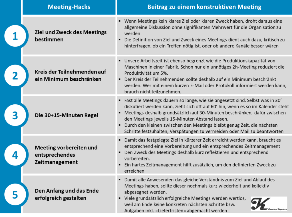 Ich selbst bin mittlerweile fast nur noch in Meetings und habe deshalb schon viele Termine unproduktiv gestaltet. Meine Erkenntnisse daraus habe ich in 5 Work Hacks für produktivere Meetings verarbeitet: