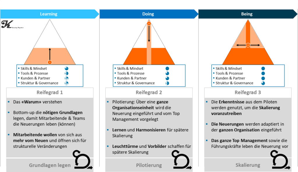 Es besteht allerdings ein grosses Risiko, dass Transformationsvorhaben zu klein gedacht sind,, wenn agile Werkzeuge unreflektiert eingesetzt werden. So sind MVP, Hacks oder Pilotierungen zwar gute Ansätze in der Organisationsentwicklung. Damit solche Bemühungen aber nicht zu Strohfeuer werden, braucht es ein kohärentes, grossgedachtes Vorgehen. Der unten dargestellte Dreischritt zeigt auf, wie agile Instrumente der Organisationsentwicklung (bspw. MVP, Hacks oder Pilotierungen) sowie generelle agile Prinzipien (iteratives Vorgehen, sequenzielle Mehrwerterbringung, absolute Ergebnisorientierung etc.) in Transformationen genutzt werden können, damit auch „grosse Veränderungen“ angegangen werden können.