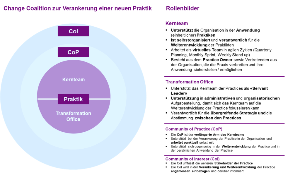 Wie in einem anderen Beitrag aufgezeigt, braucht es eine Change Coalition, damit eine neue Praktik verankert werden kann. Eine Change Coalition besteht aus drei Kreisen, die unterschiedlich intensiv in die Transformation einbezogen werden müssen.