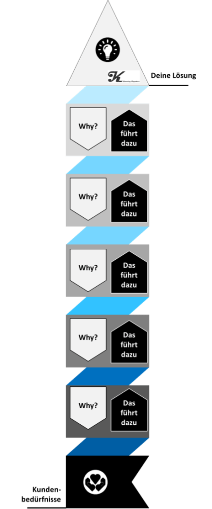 Das Fishbone-Diagramm ist ein alt-bewährtes Tool, um mit „5x Warum-Fragen“ auf die Ursachen eines Problemes vorzustossen. Entsprechend kann es auch gut genutzt werden, um herauszufinden, ob die eigene Lösung auch tatsächlich die innersten Bedürfnisse des Kunden trifft. Umgekehrt kann vom Kundenbedürfnis mit dem fünffachen Ableiten durch „Das führt dazu“ auf eine möglichst simple Lösung vorgestossen werden. Wenn das Ergebnis sowohl vorwärts als auch rückwärts Sinn macht, dann scheint die Idee tatsächlich grosses Potenzial zu haben!
