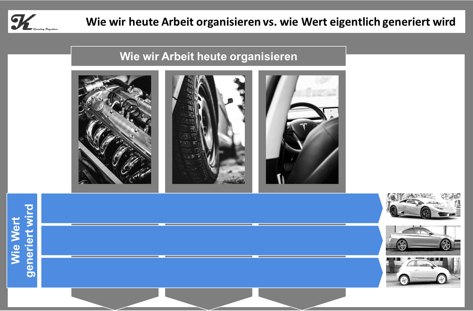 Doch so wird in wenigen Fällen Wert generiert. In den meisten Fällen braucht es cross-funktionale Teams, welche gemeinsam ein Produkt, eine Dienstleistung oder eine organisationsinterne Unterstützung anbieten.